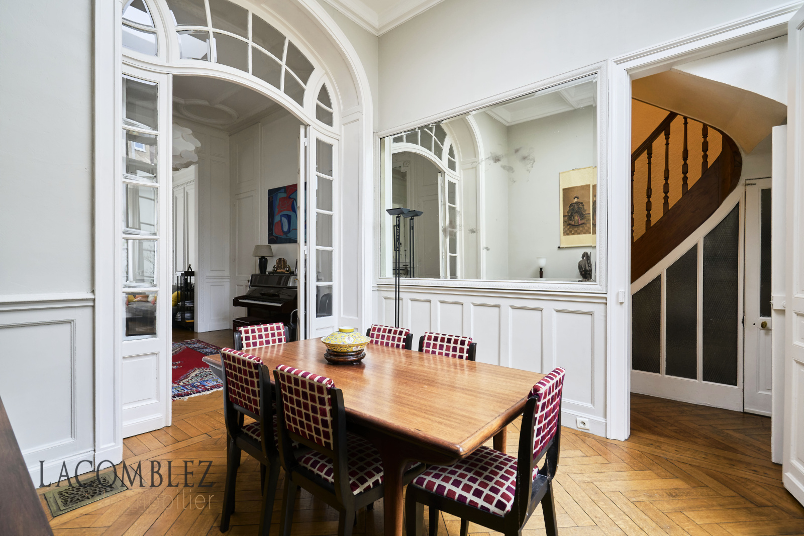 Au rez-de-chaussée, un grand hall d'entrée, un triple-séjour avec un magnifique parquet chevron d'origine, cheminée et belles hauteur sous plafonds, aussi, une cuisine équipée dans laquelle vous pouvez prendre vos repas.