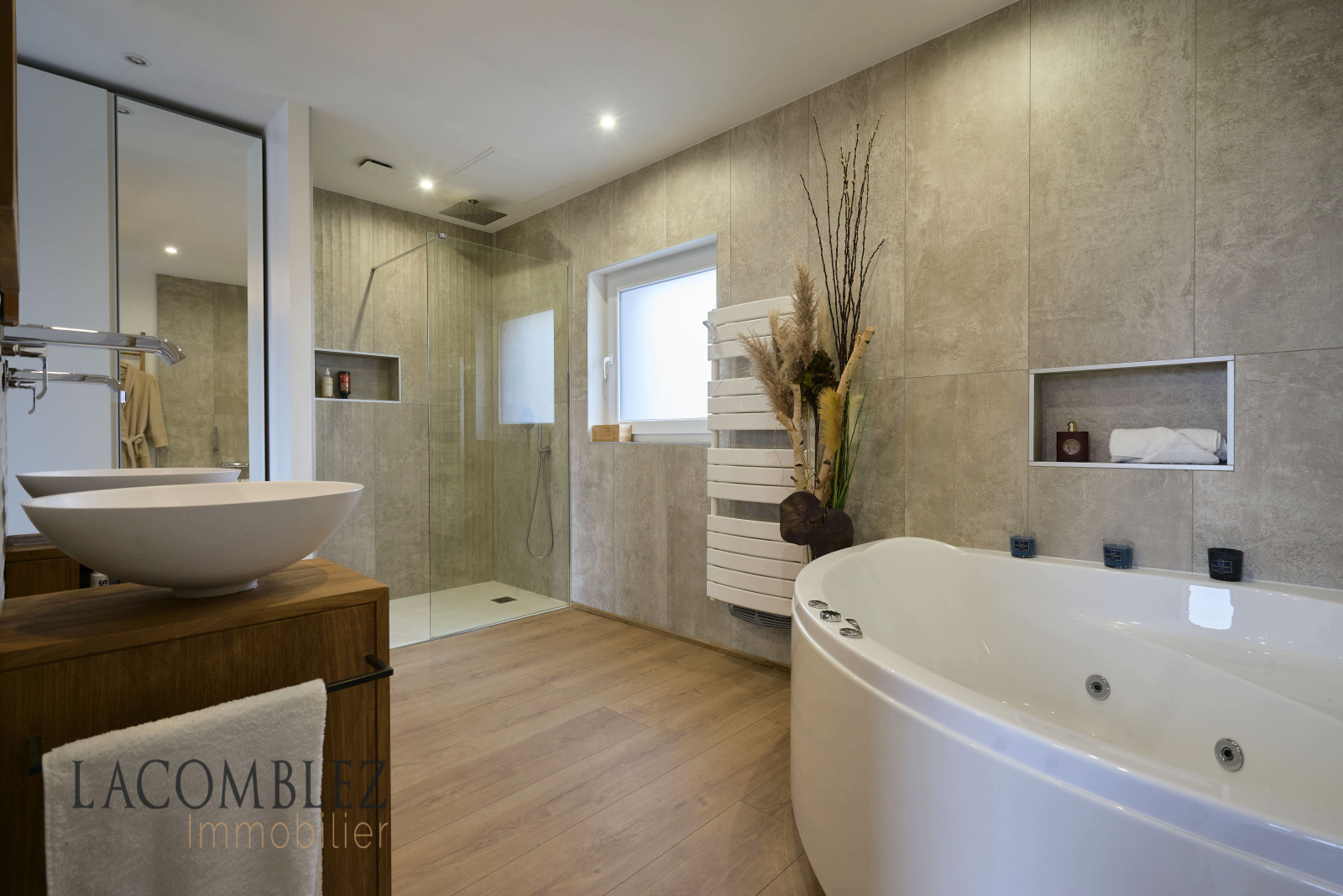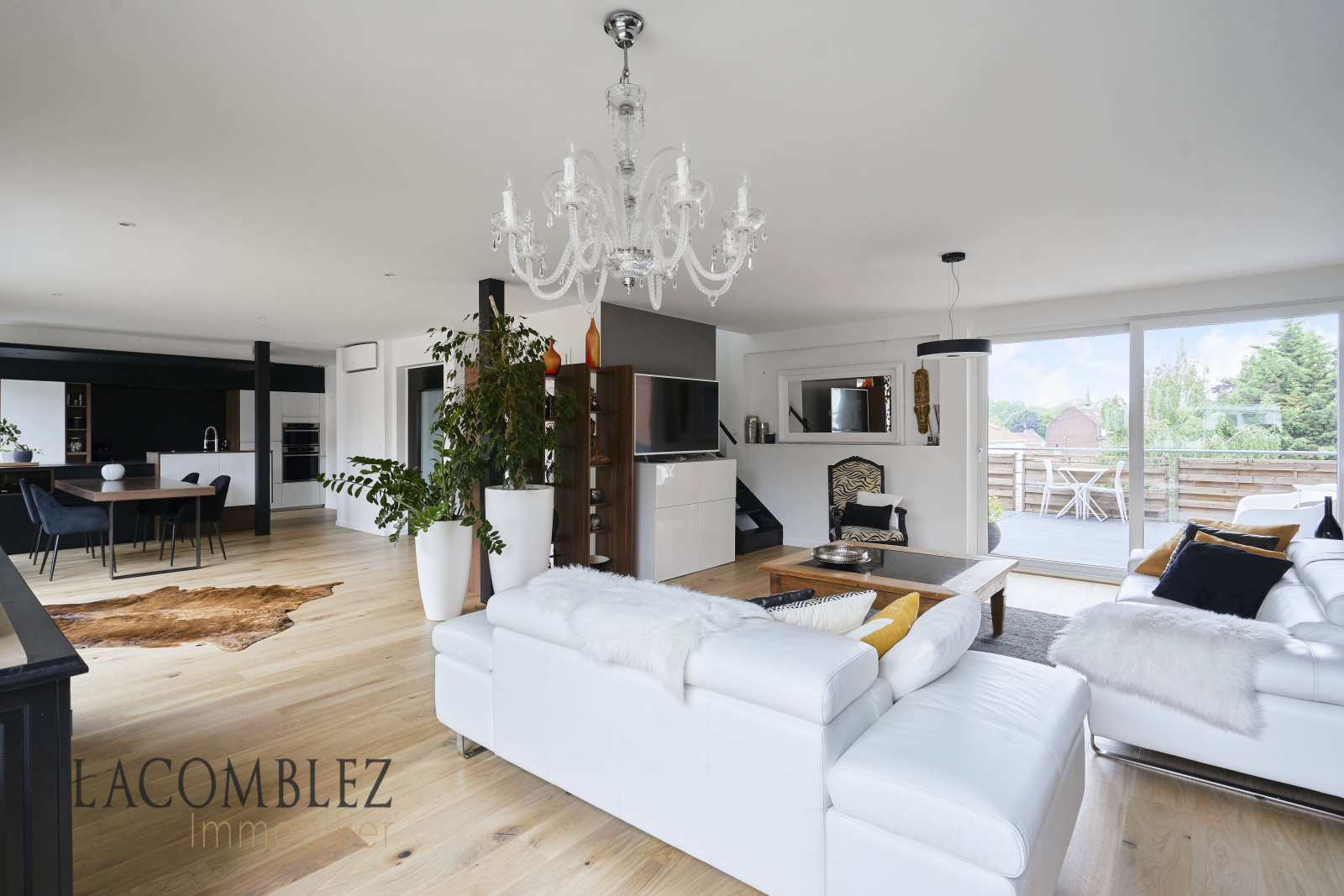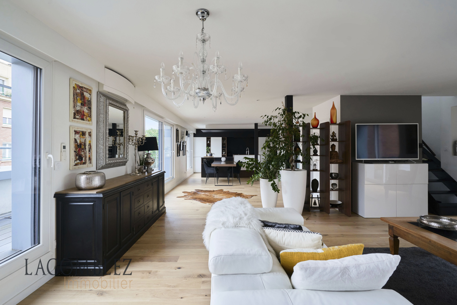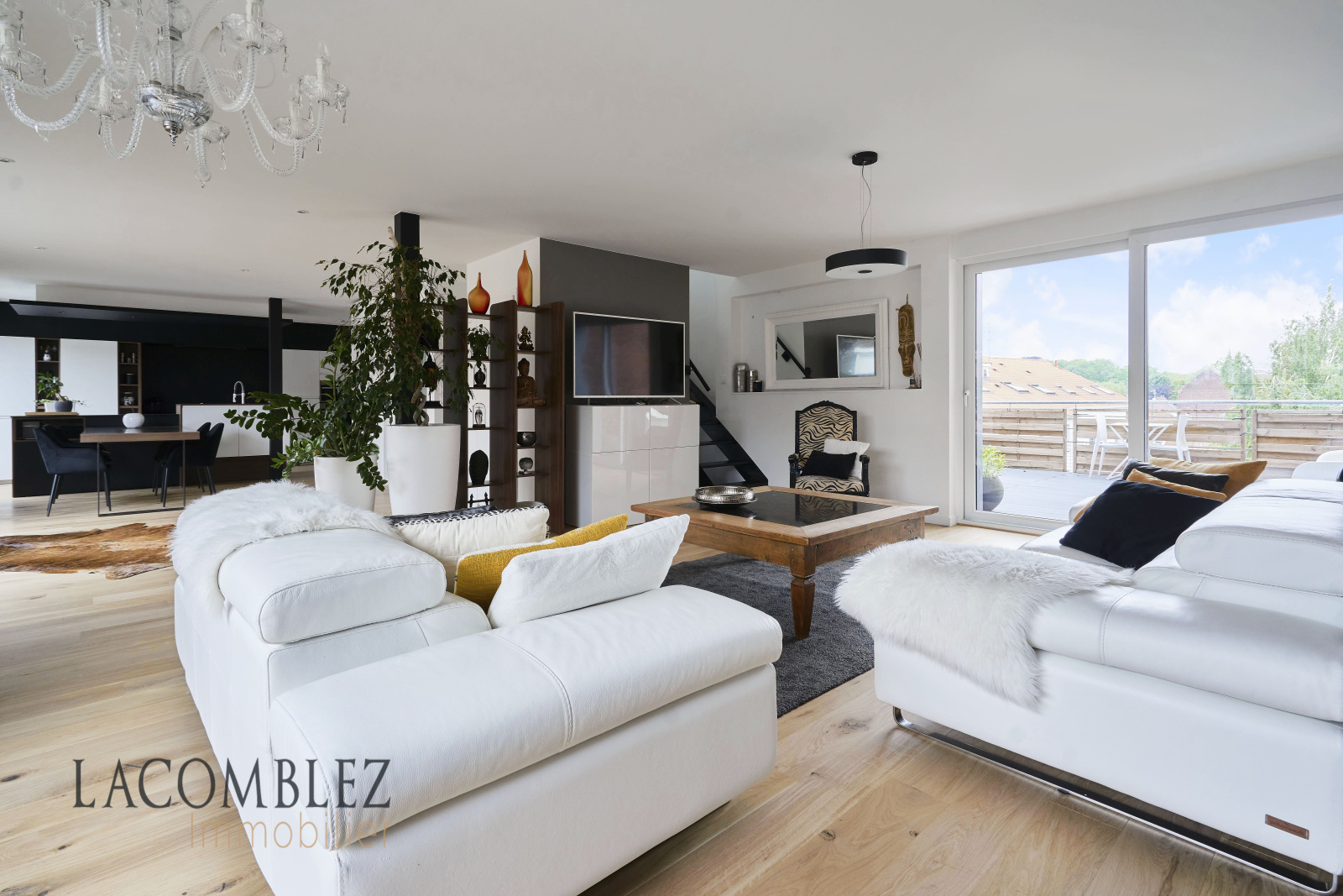 Dès votre entrée, vous serez ébloui par l'attention portée aux détails et la conception intelligente de cet espace. Le vaste salon, la salle à manger et la cuisine équipée ouverte s'étendent sur 80 m², créant un espace de vie spacieux et convivial. Les grandes baies vitrées laissent entrer une abondance de lumière naturelle et offrent une vue panoramique sur les terrasses environnantes.