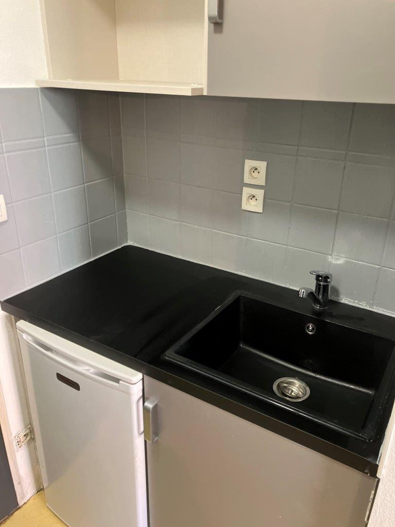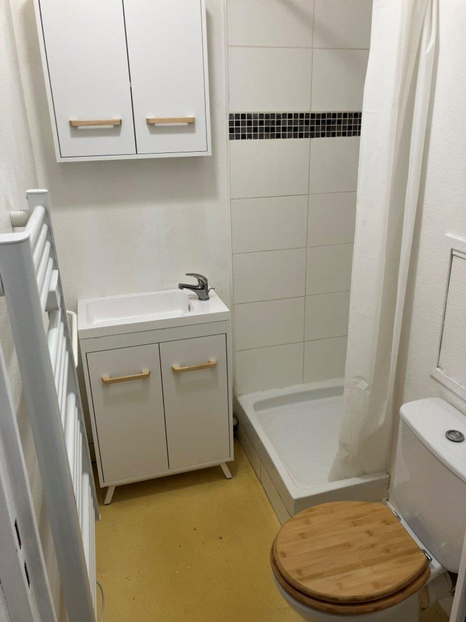 Une kichenette équipée, avec réfrigérateur ; une salle de douche avec wc ; et une pièce salon/séjour, chambre.